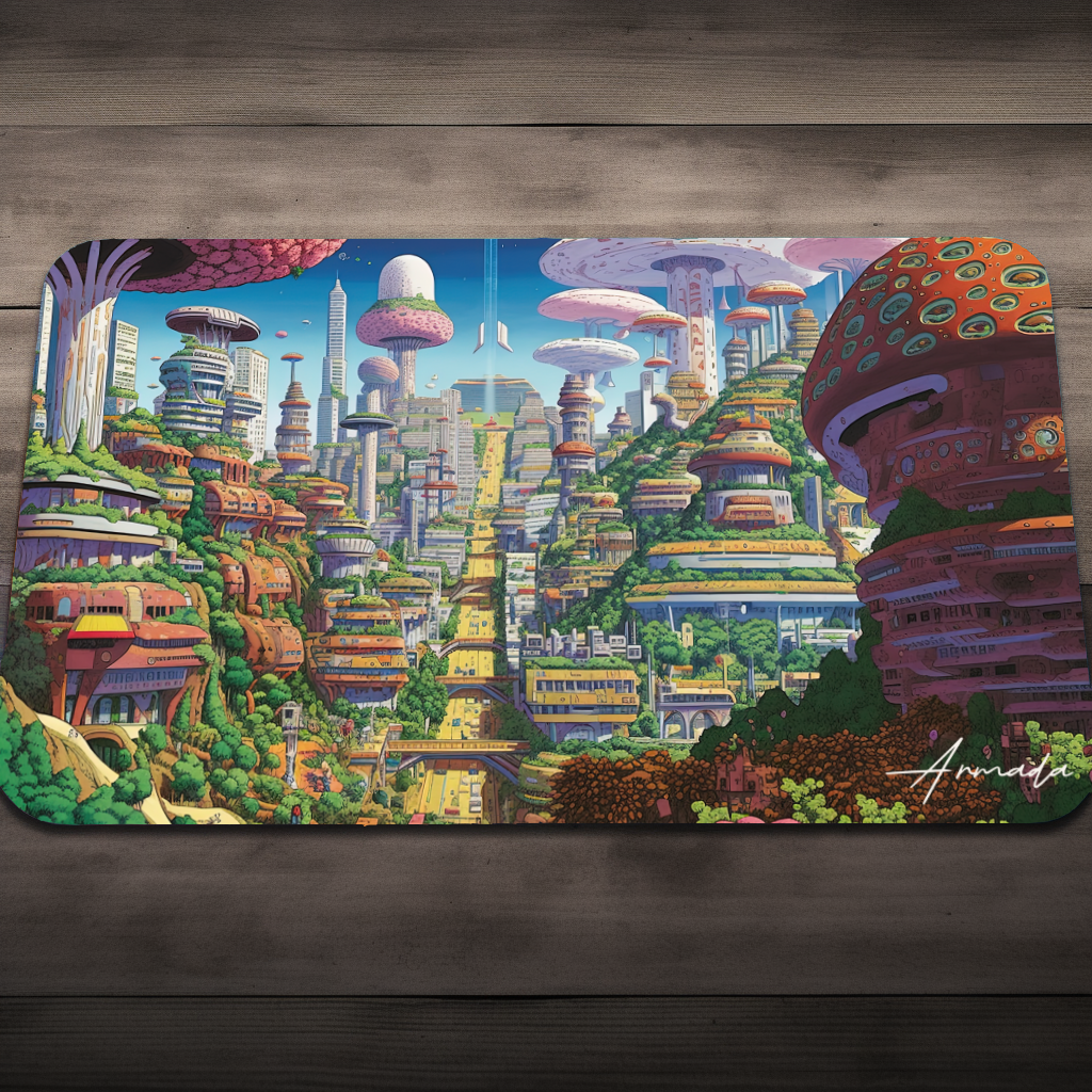 In the heart of the galaxy, nestled amidst glittering stars and nebulous gas clouds, lies Spora, a thriving metropolis where bio-luminescent mushroom skyscrapers pulsate in a hypnotic rhythm, echoing the harmonious dance of life. The Sporans, sentient fungi-beings, live in symbiosis with their city, their thoughts spreading through mycelial networks, merging individual consciousness into a unified intelligence. The rhythm of Spora resonates across the cosmos, a beacon of harmony and coexistence, an echo of a future where technology and nature interweave seamlessly into a vibrant tapestry of life.